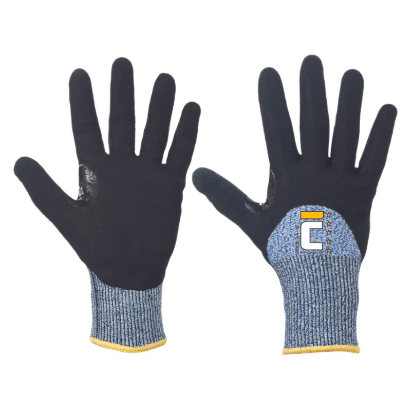 Materiál máčení: nitril, materiál rukavice: HPPE , Spandex , polyamid (nylon). Popis: pletené bezešvé rukavice se 3/4 máčením v mikroporézním nitrilu s ochranou vůči řezu B, zesílení v oblasti mezi palcem a ukazováčkem pro delší životnost rukavice, vhodné pro manipulaci s ostrými a mastnými díly, manipulaci se sklem, opracování mastných kovů anebo plechů nebo údržbu strojů, rukavice neobsahuje skelné nebo ocelové vlákno a slpňuje Oeko-Tex.