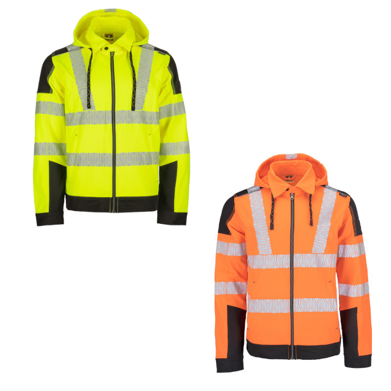 HV polyesterová 4way strečová tkanina, segmentované reflexní design pruhy, dvě boční kapsy, odnímatelná kapuce, zesílení v oblasti ramen. Svrchní zesílená vrstva: 100 % polyamid (nylon), 215 g/m2, CORDURA®. Povrstvení: polyuretan. Svrchní HI-VIS materiál: 100 % polyester, 280 g/m2, 4-way stretch. Normy: EN ISO 13688,