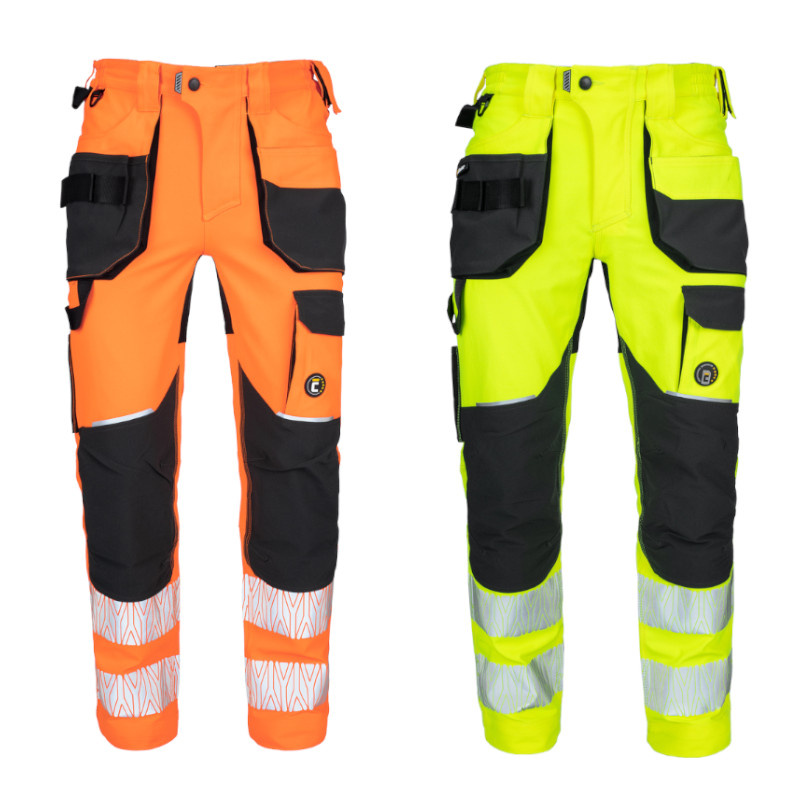 HV polyesterová 4way strečová tkanina, segmentované reflexní design pruhy, multifunkční boční kapsy, zesílený rozkrok, zesílení v oblasti kolen s možností vkládání kolenních chráničů, nastavitelná délka nohavic. Zesílení sedla: 90 % polyamid (nylon) , 10 % Spandex, 260 g/m2. Svrchní HI-VIS materiál: 100 % polyester, 280 g/m2, 4-way stretch. Zesílení kolenních kapes: 96 % polyester , 4 % Spandex, 220 g/m2. Normy: EN ISO 13688, EN ISO 20471