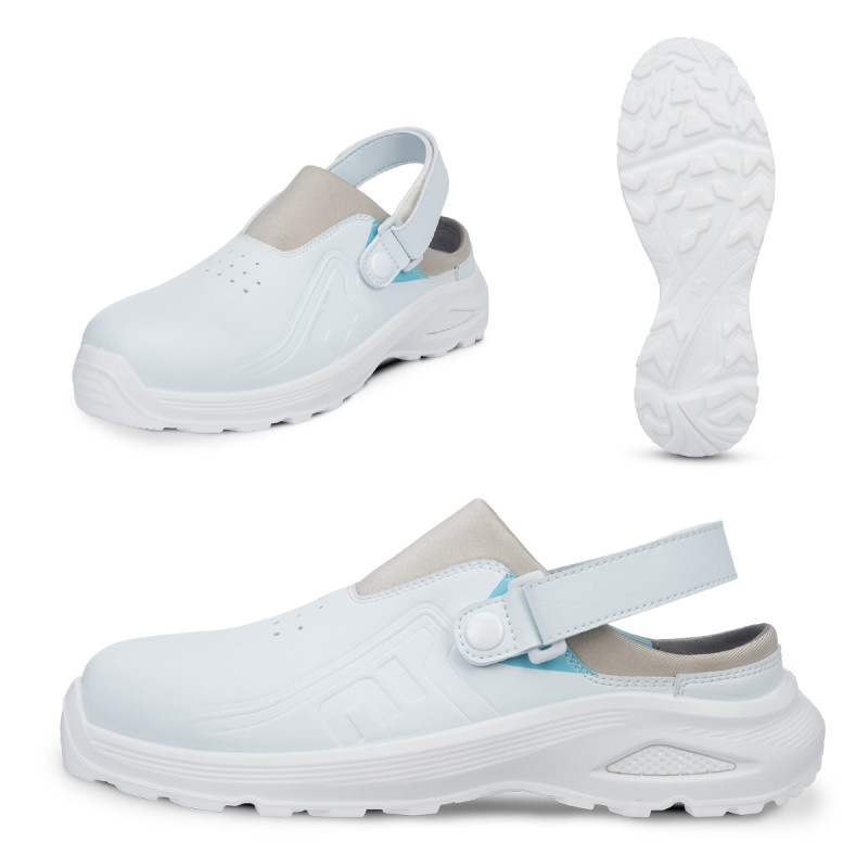Bílý pracovní pantofel HYGOSAFE je navržený pro prostředí se zvýšenými nároky na hygienu, čistotu a komfort, dvouhustotní podešev PU/PU s vkladkou z NHP pěny zajišťuje výrazně měkčí došlap a vyšší pohodlí při celodenním nošení, unikátní kombinace hydrofobního mikrovlákna a neoprenu vytváří odolný, snadno udržovatelný svršek, který si zachovává pružnost a komfort, antibakteriální mesh podšívka podporuje ventilaci a příjemné klima uvnitř obuvi, odepínací patní pásek na suchý zip umožňuje upevnění obuvi dle individuálních požadavků pracovníka. Svrchní materiál: hydrofobní mikrovlákno, materiál podešve: PU/PU+NHP, materiál podšívky: antibakteriální mesh. Norma: EN ISO 20347 (OB FO E A SR), EN 61340-5-1